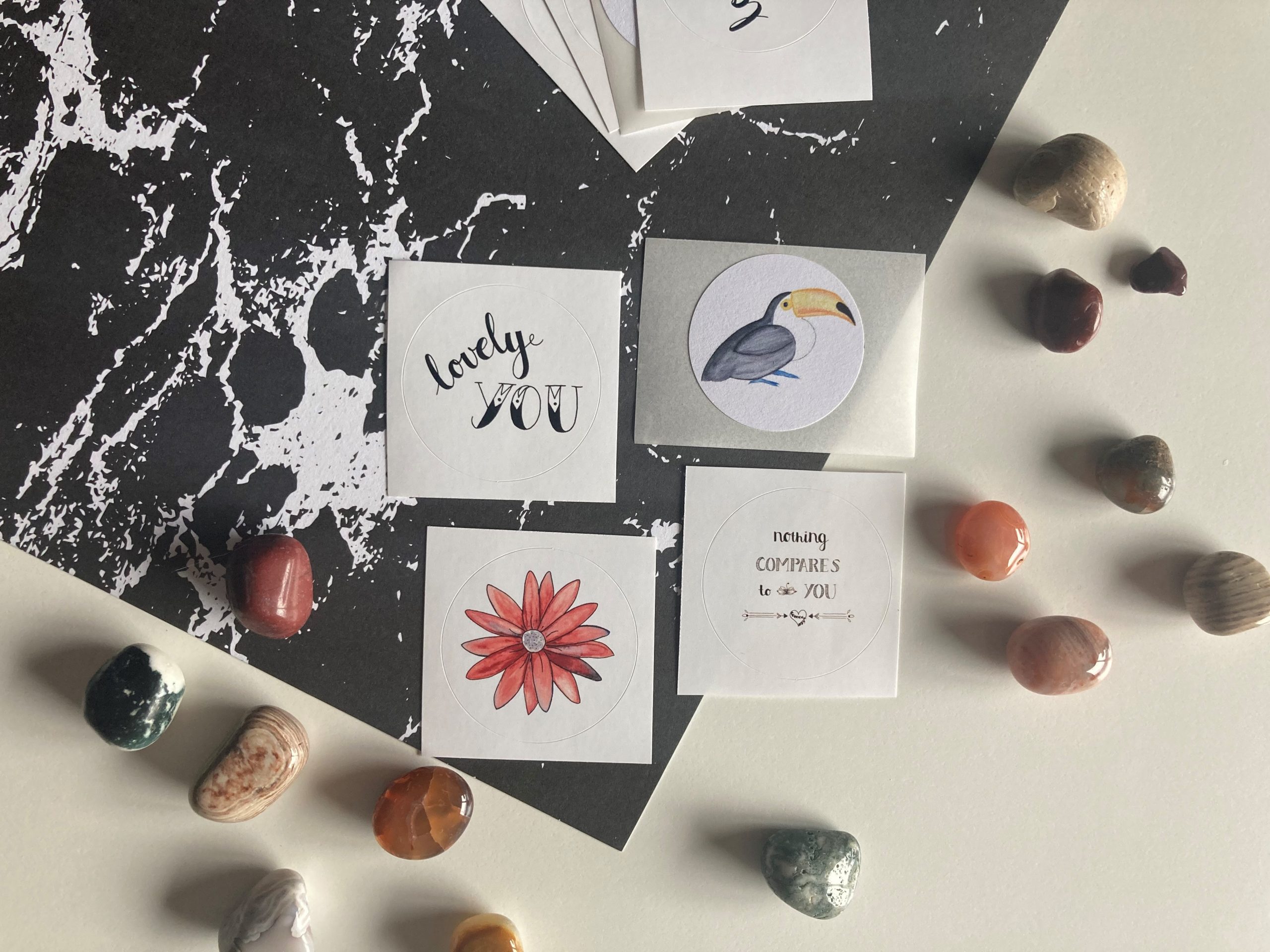 Stickerset bestehend aus 8 runden Stickern, mit 4 verschiedenen Motiven